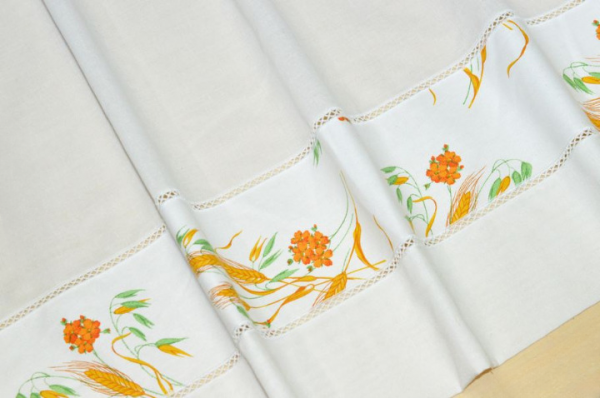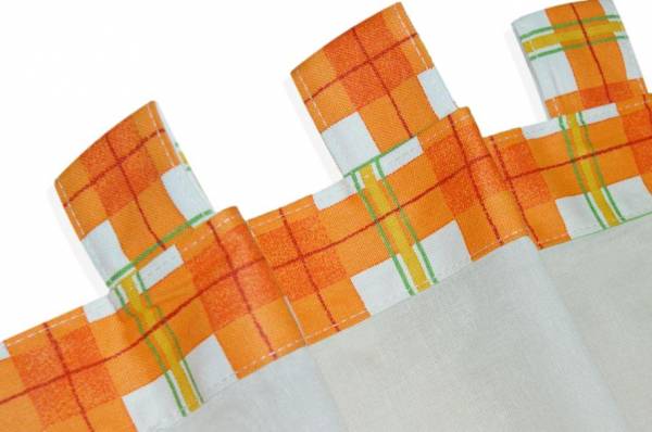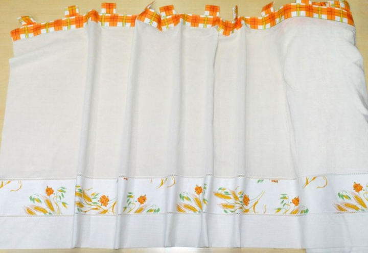 Tenda tirolese venduta a metraggio, con orli da realizzare sui lati, mentre la parte superiore e inferiore sono già rifinite. La parte superiore è dotata di anelli in stoffa integrati, pronti per l’inserimento del bastone.