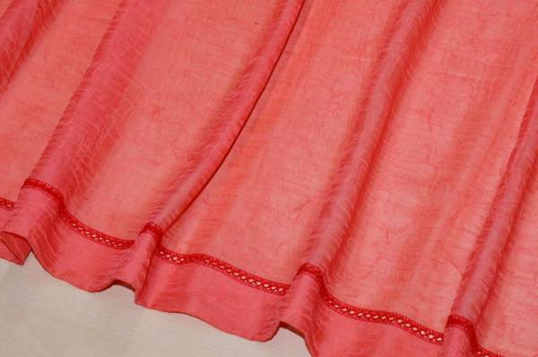 Tendino in velo stropicciato color corallo, venduto a metraggio. Il tessuto è rifinito sui lati, quindi il taglio va effettuato nella parte superiore e inferiore, per una confezione ordinata e pronta da montare.