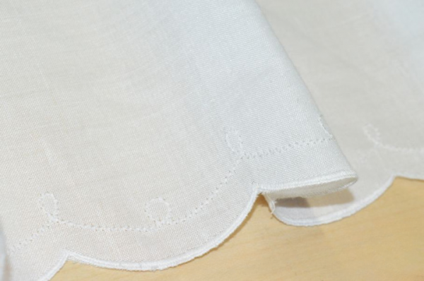 Tessuto tenda bianco in tessuto leggero e luminoso, decorato con incasso in nastrino di raso alto 3 cm che dona eleganza e delicatezza. La distanza tra l’incasso e il merletto finale è di 38 cm, creando un equilibrio armonioso tra parte liscia e decorazione.