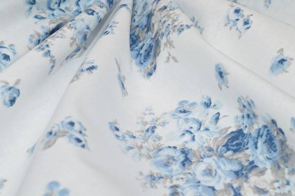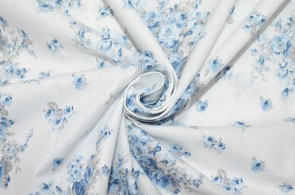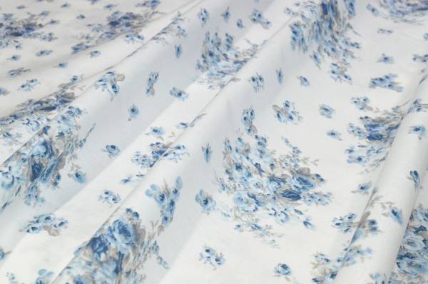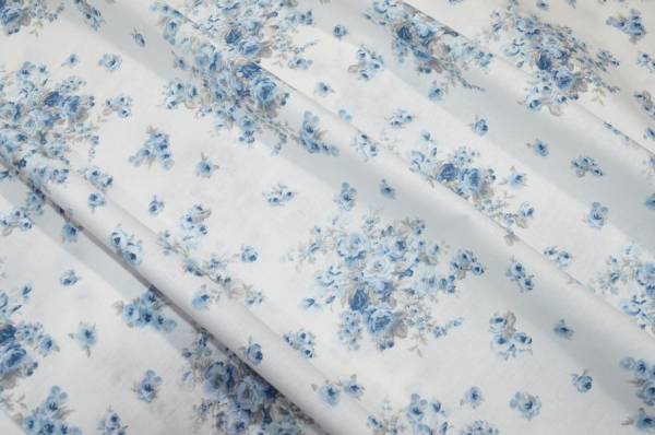 Tessuto in puro cotone dalla mano coprente e morbida. Il fondo bianco viene decorato dalla fantasia a mazzetti floreali azzurri. Di pesantezza ideale per realizzare teli grandfoulard, rivestimento di cuscini, mantovane, lavori di cucito creativo, sacchi copripiumini e lenzuola.
