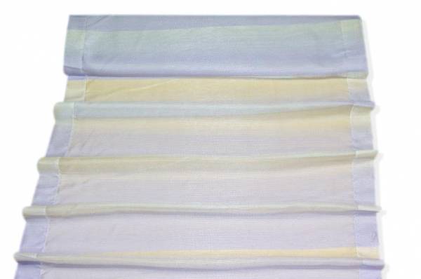 Tendino in organza a fasce orizzontali color lilla, caratterizzato da un elegante effetto sfumato che passa gradualmente dal lilla più intenso a tonalità più chiare fino a zone trasparenti. Questo gioco di colore e luce crea un aspetto delicato e raffinato, ideale per valorizzare ambienti luminosi con leggerezza e stile. La banda laterale misura 5 cm.