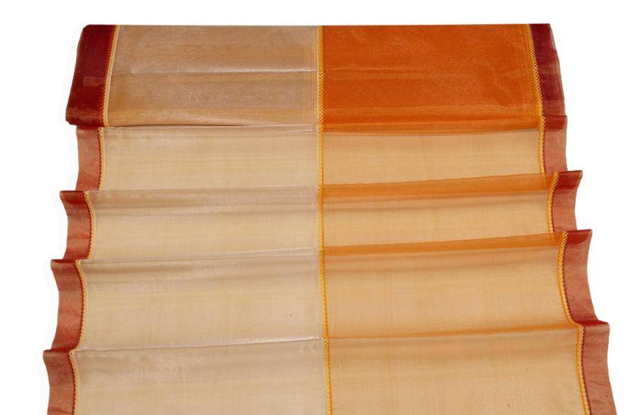 Tendino in organza leggerissima e trasparente, dall’aspetto arioso e luminoso. Il tessuto è diviso da un inserto centrale ricamato che separa la tenda in due sezioni: una color arancio e l'altra nei toni del giallo chiaro. Le due tonalità si mescolano leggermente, creando un elegante effetto cangiante e riflessi che richiamano l’una il colore dell’altra.