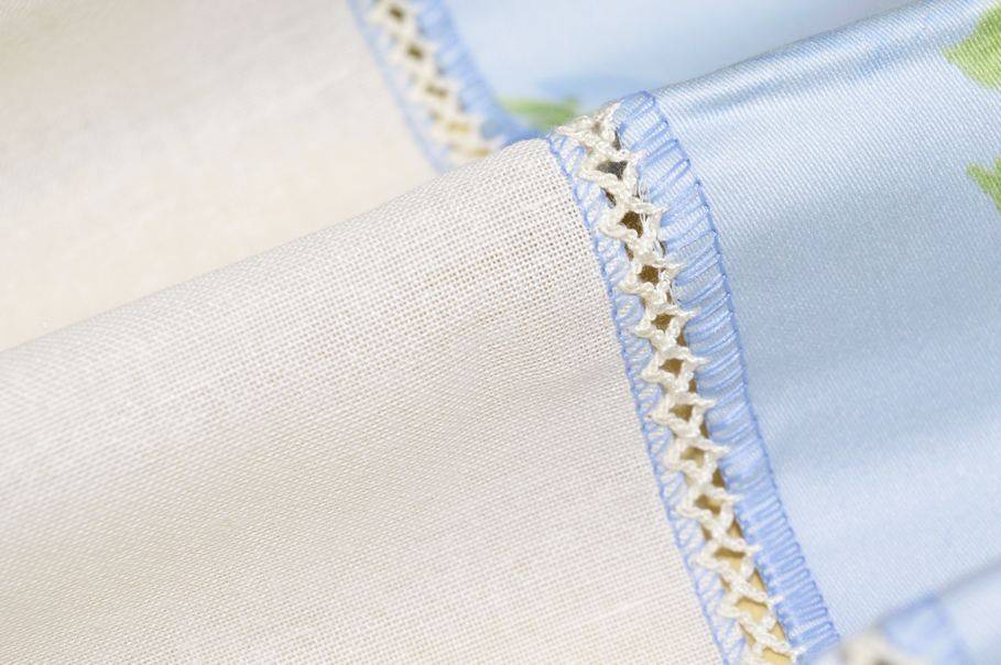 Tendino con fondo bianco di media coprenza, ma di mano leggera, arricchito da un delicato bordo floreale azzurro che misura 6,5 cm.
