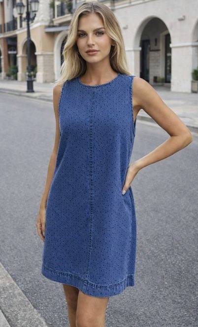 Tessuto jeans chambray leggero con micro pois dal diametro di 1,5 mm. Morbido al tatto, traspirante e con aspetto denim delicato, presenta una struttura fine e una buona vestibilità.