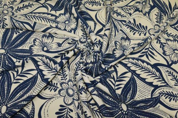 Tessuto in pura viscosa dalla mano morbida, fresca e cadente. La base panna è valorizzata da una fantasia floreale nei toni dell’azzurro. Ideale per realizzare capi primavera/estate come camicette, abitini leggeri sia corti che lunghi che mettono in risalto la fantasia, gonne e top.