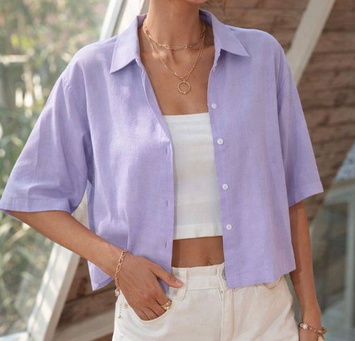 Tessuto camiceria in puro cotone lilla in rasatello, dalla mano leggera, liscia e setosa al tatto. La superficie si presenta compatta e luminosa, piacevolmente fresca sulla pelle.