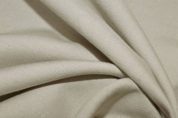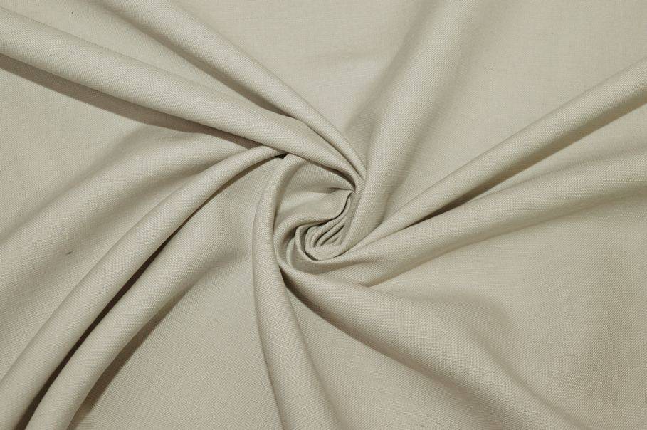 Tessuto in misto lino color sabbia, dalla mano piacevolmente fresca, morbida e liscia.