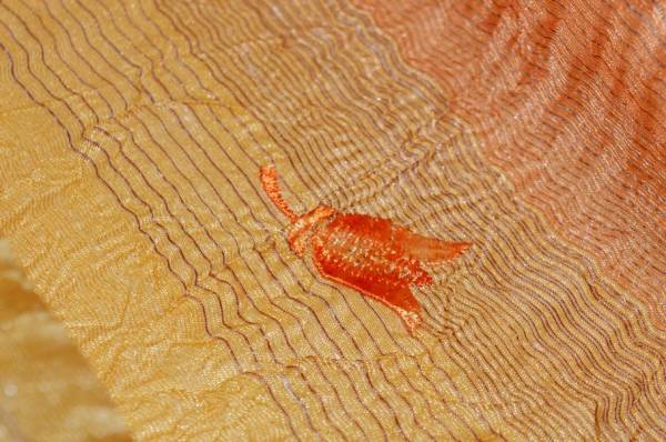 La superficie è caratterizzata da un particolare effetto stropicciato che dona movimento e dinamicità. Viene inoltre valorizzato da una fantasia a righe nei toni del giallo e dell’arancio.