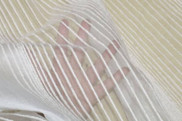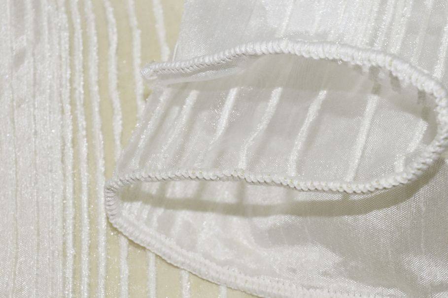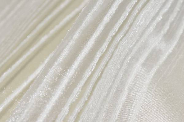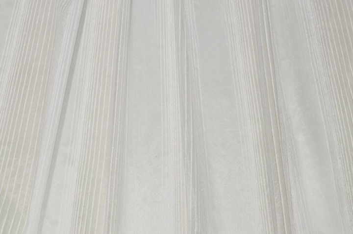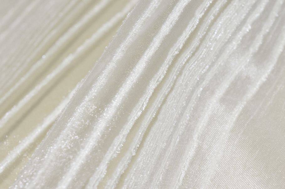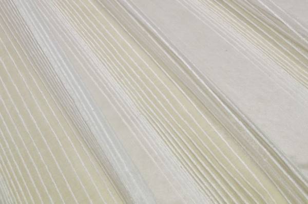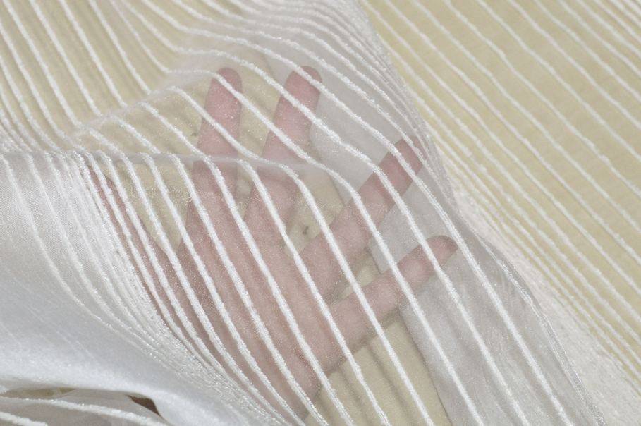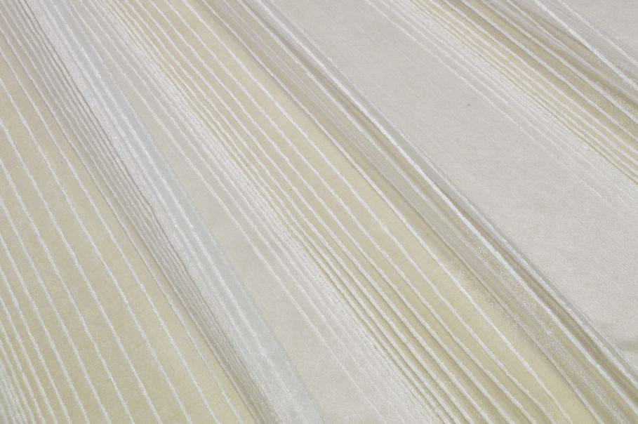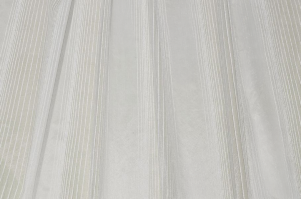 Tessuto per tende in organza colore panna/avorio, semitrasparente, leggero e vaporoso, con una caduta morbida ed elegante. La stoffa filtra la luce in modo delicato, infatti il fondo alterna righe verticali irregolari di diversa larghezza e coprenza, creando un piacevole effetto di movimento. Il tessuto presenta inoltre sottili righine in ciniglia in tono che ne arricchiscono e impreziosiscono l’aspetto.