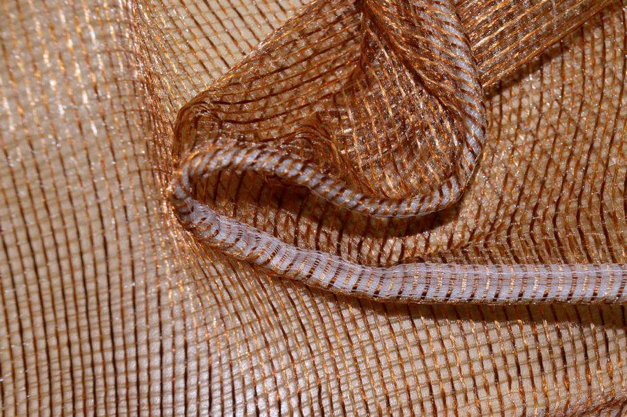 Tessuto per tende in rete lurex color rame, luminoso ed elegante, caratterizzato da una trama leggera arricchita da fili lurex che donano caldi riflessi metallici. La struttura a rete crea un effetto arioso e raffinato, valorizzando la finestra con un tocco sofisticato e contemporaneo.