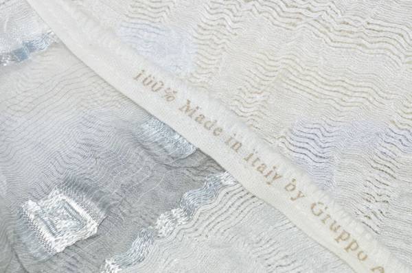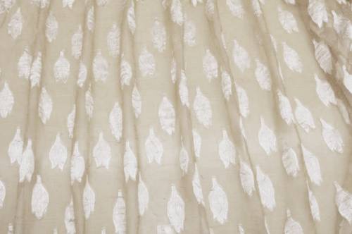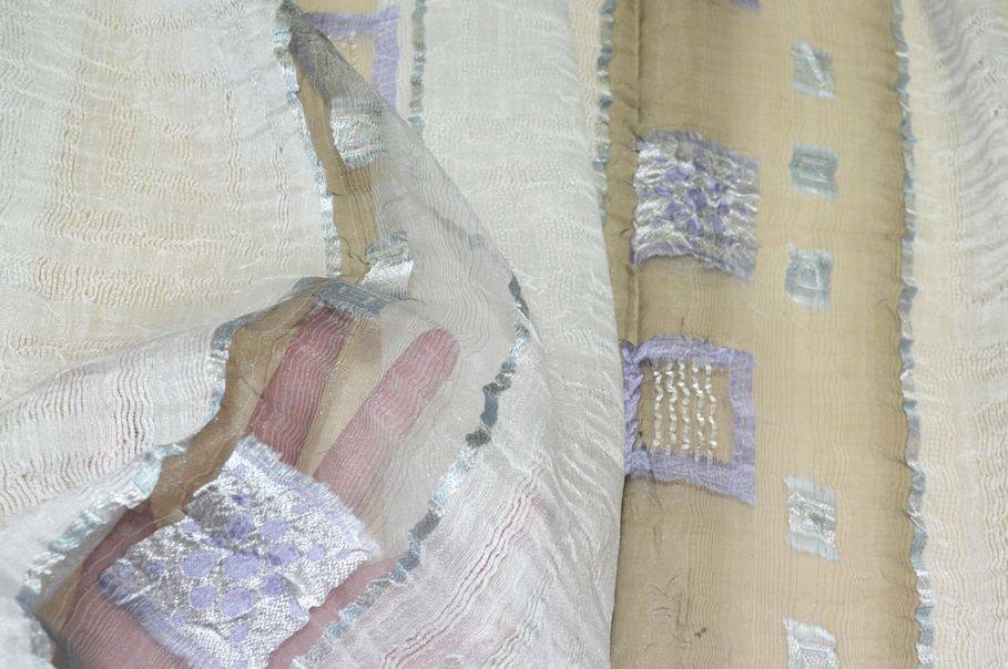 Tessuto per tende in organza misto lino 100%Made in Italy con ricamo fill coupé lilla, elegante e leggero. Il ricamo lilla, realizzato con tecnica fill coupé, aggiunge un delicato motivo decorativo, conferendo stile e raffinatezza al tessuto.