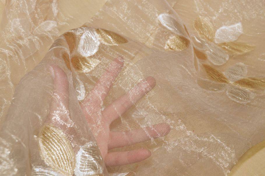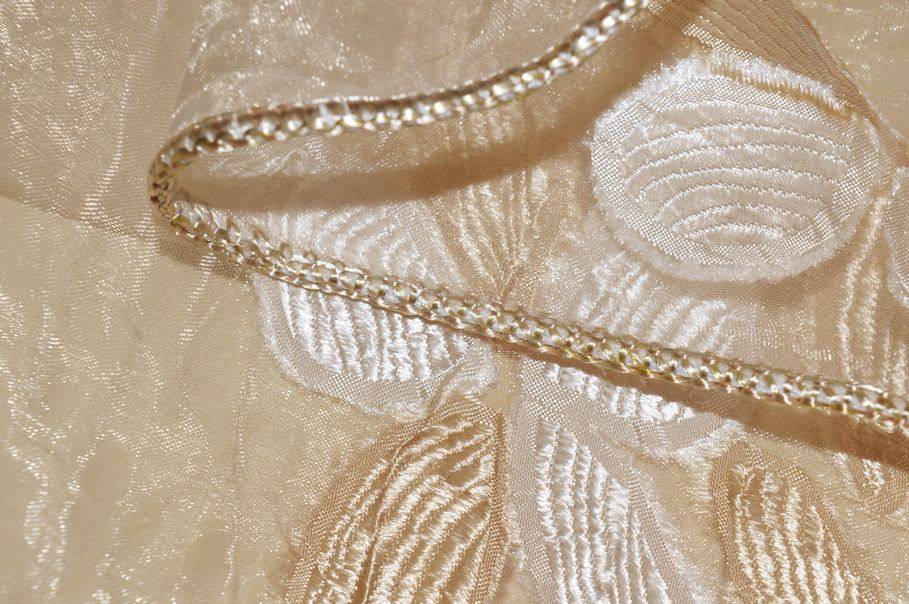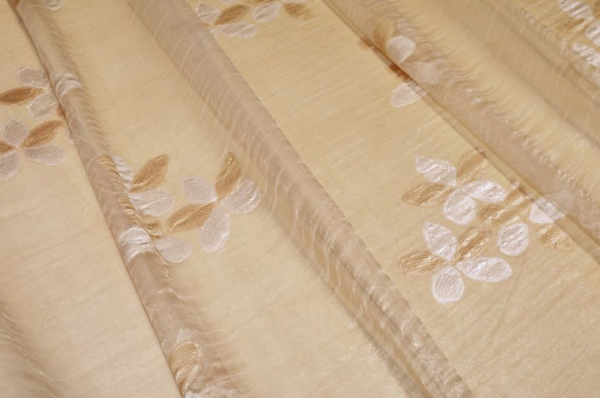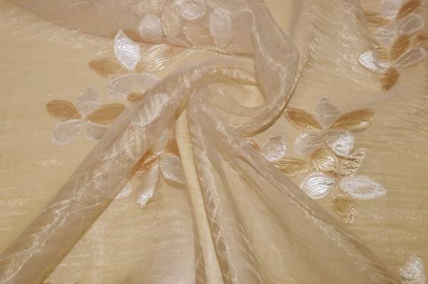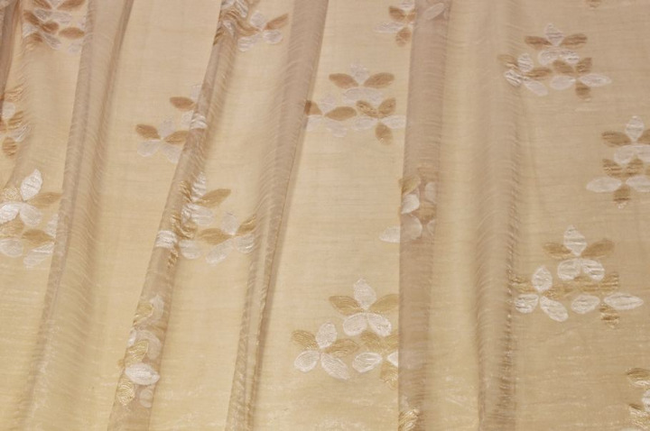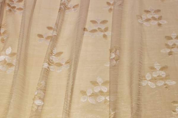 Tessuto per tende in organza totalmente trasparente, leggero e con la tipica mano vaporosa dell’organza, perfetto per realizzare arricciature sia classiche che più ricche. Il fondo color champagne è impreziosito da elegantissimi fiori in fill coupé in tono e color avorio che creano un raffinato gioco decorativo, rendendo la tenda particolarmente luminosa e di gran classe.