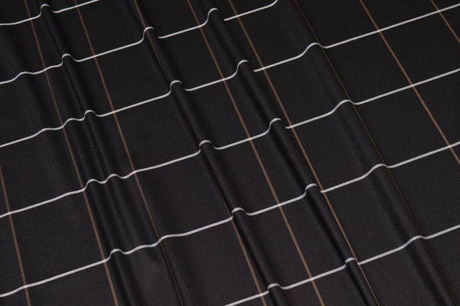 Il motivo finestrato misura 8x8 cm, conferendo al tessuto un elegante design minimal ed elegante. La tinta unita nera lo rende versatile e raffinato, ideale per abiti uomo, giacche, tailleur con gonne abbinate e completi da mezza stagione.