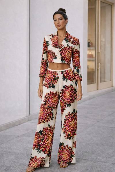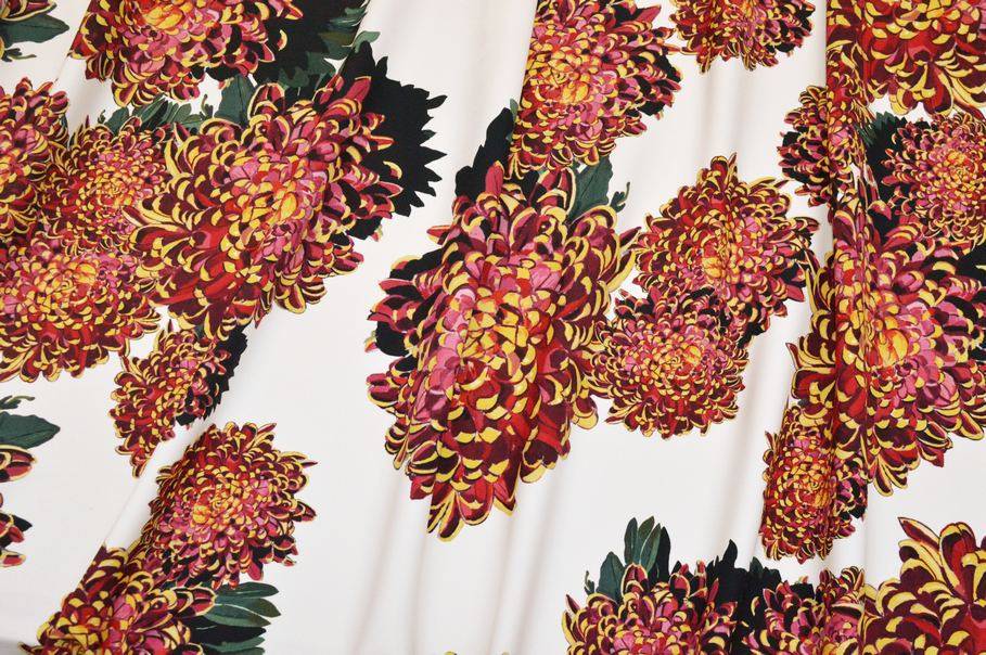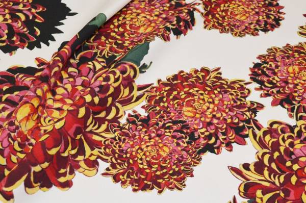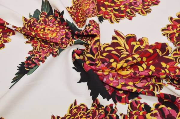 La superficie è valorizzata da una fantasia sgargiante con forti contrasti di colore, perfetto per capi originali ed unici nel loro genere. Ideale per la realizzazione di vestiti, gonne, giacche leggere e pantaloni morbidi.