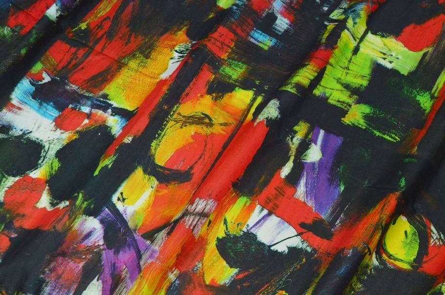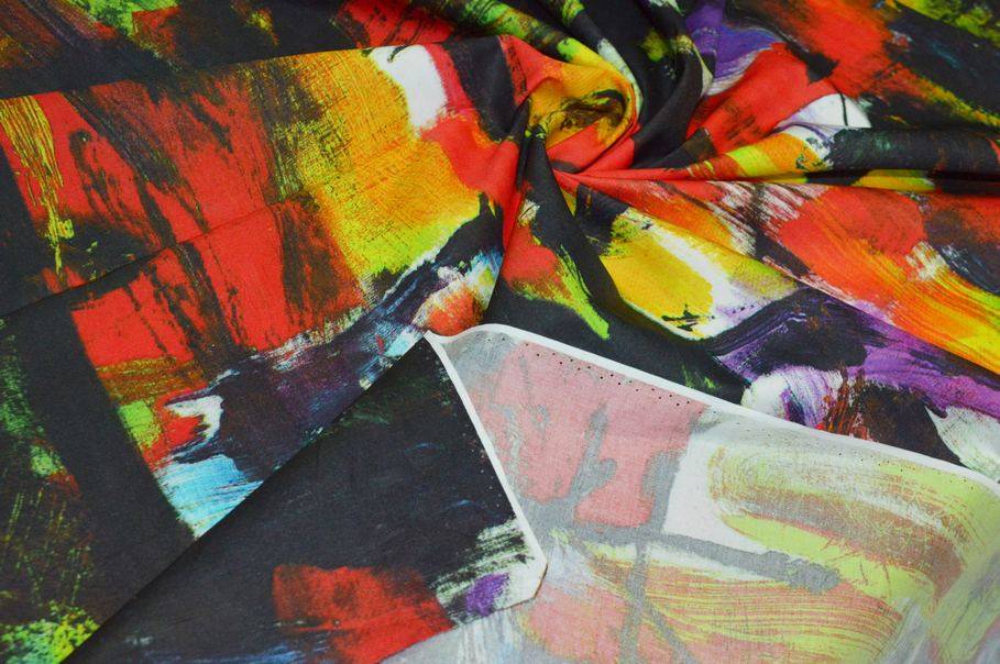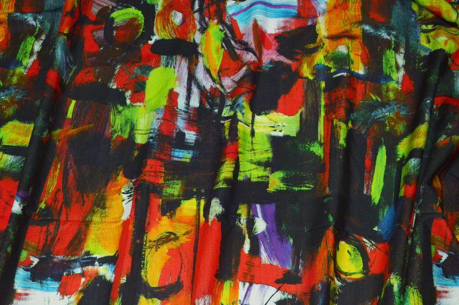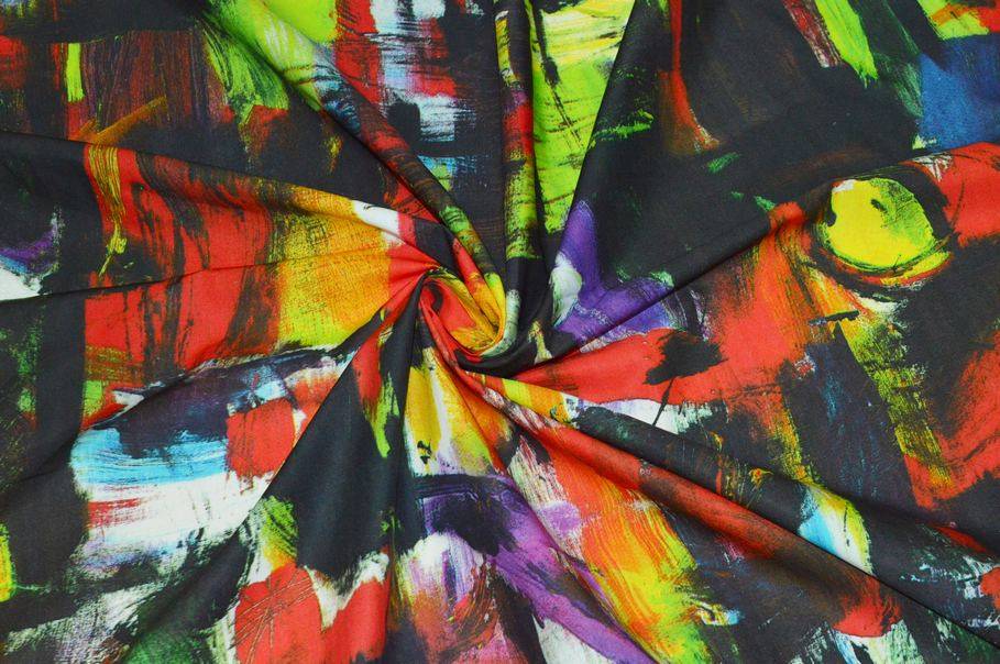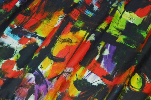 Il tessuto presenta una fantasia astratta dai colori vivaci, che dona movimento e carattere alla superficie, creando un effetto moderno e originale. Perfetto per la realizzazione di camicie, abitini sia corti che lunghi, top e piccoli accessori moda.