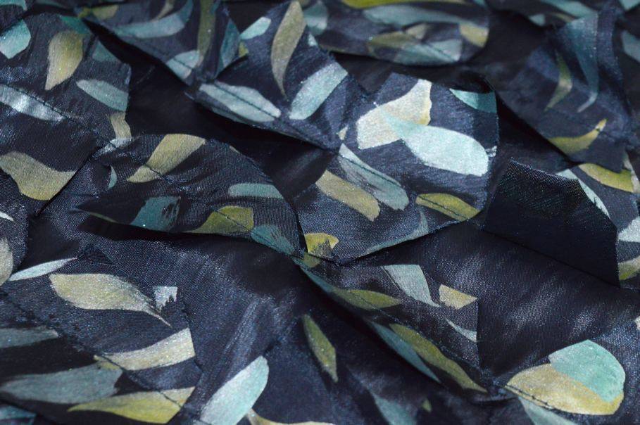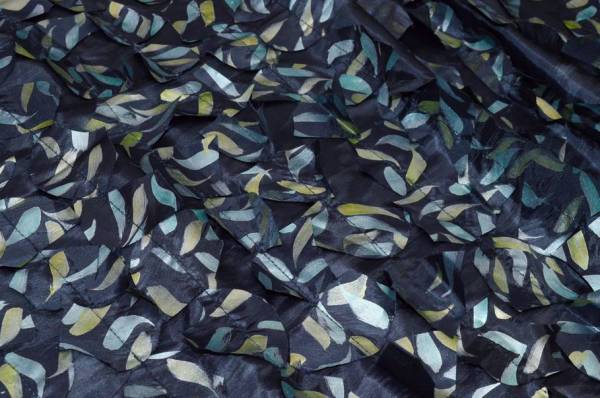 Il secondo tessuto, con lo stesso fondo, presenta una lavorazione in rilievo con applicazioni cucite, che creano un effetto tridimensionale originale e dinamico.