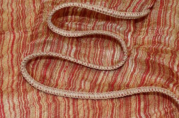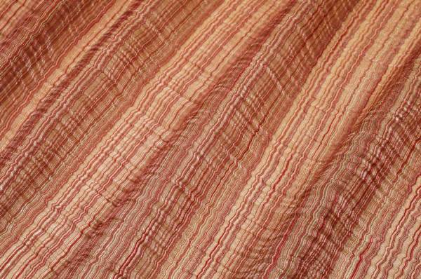 Tessuto in organza con effetto stropicciato che dona alla superficie le tipiche increspature irregolari di questa lavorazione. Il tessuto nasce per la confezione di tendaggi, in particolare di tende arricciate, dall’aspetto leggero, cadente e trasparente.