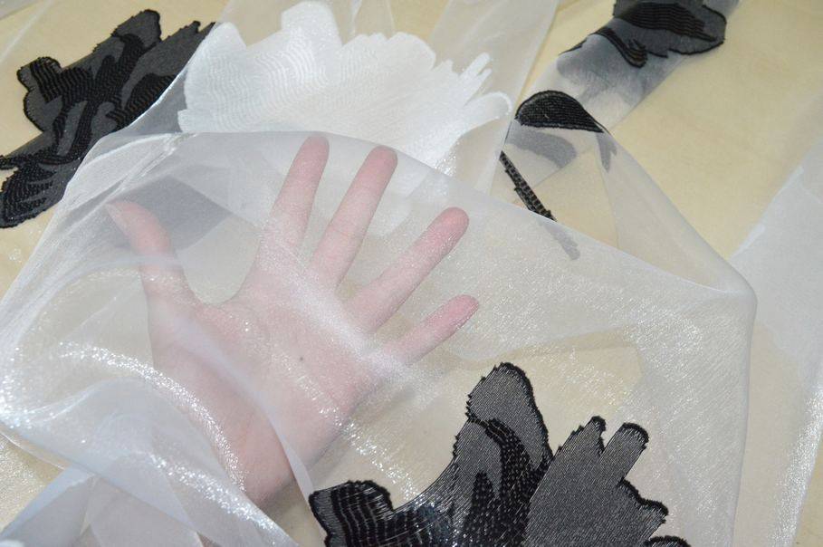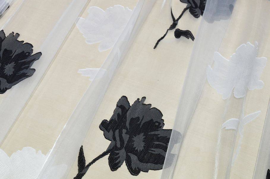 Tessuto per tende in organza bianca, leggerissima e trasparente, caratterizzato da un elegante ricamo a maxi fiore in bianco e nero alternati, che crea un grande impatto visivo e un effetto sofisticato.