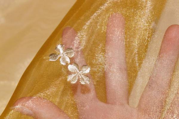 Tessuto in organza leggero, morbido e molto trasparente, perfetto per la realizzazione di tende arricciate di qualsiasi tipologia. Il fondo oro viene decorato da piccoli fiori avorio ricamati di circa 2 cm ciascuno.