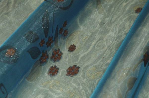 Tessuto con fondo in organza leggero, cadente e totalmente trasparente, caratterizzato da una superficie luminosa.