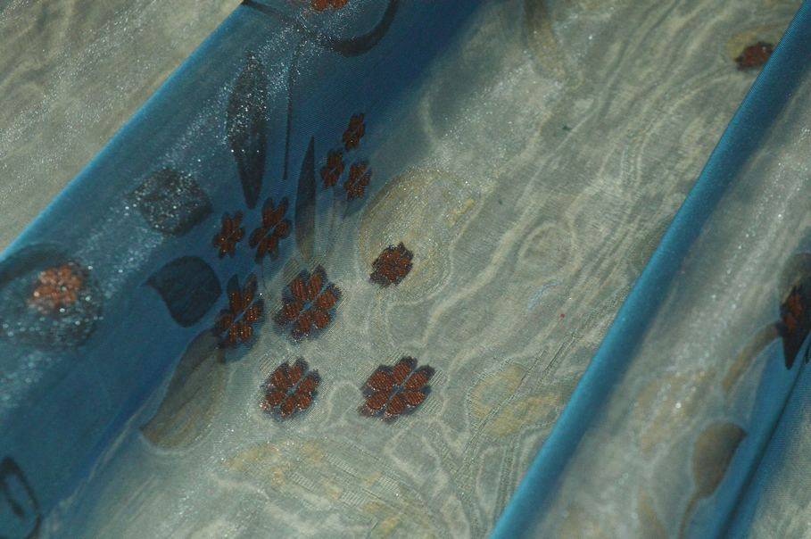 Il fondo è decorato da un raffinato disegno cashmere in tono, visibile nelle zone di trasparenza, mentre piccoli fiori color rame donano un vivace tocco di colore. Ideale per realizzare tende arricciate di ogni tipologia e per diversi allestimenti decorativi.
