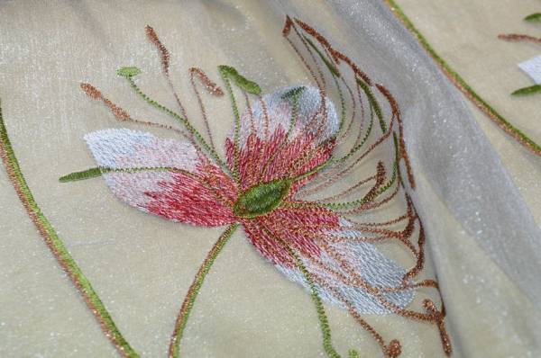 Tessuto per tende in organza leggerissima e trasparente color grigio fumo, caratterizzato da un raffinato ricamo a maxi fiore sui toni del rosa che crea un grande impatto visivo, elegante e di classe.