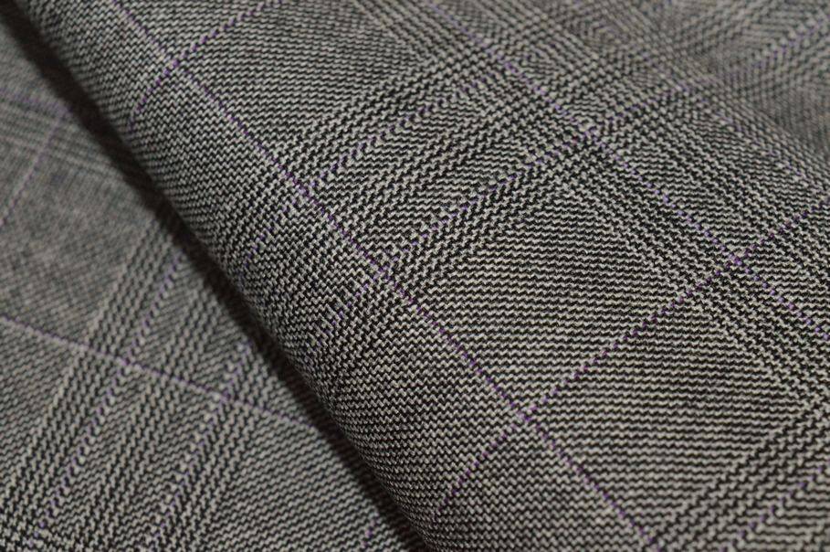 Tessuto in lana Super 130’s firmato Vitale Barberis Canonico. Il filato Super 130’s conferisce alla stoffa una superficie che si distingue per una mano molto pettinata, liscia e piacevole al tatto, indice dell’alta qualità tessile italiana. Il fondo presenta un raffinato disegno Principe di Galles caratterizzato da una sottile righina lilla a contrasto.