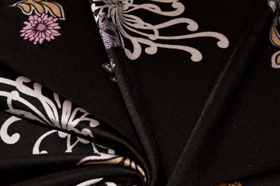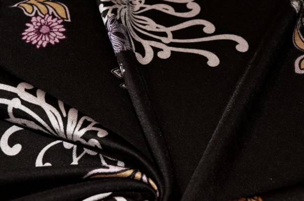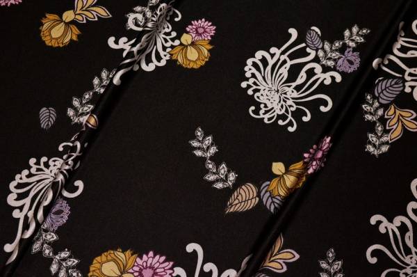 Tessuto in maglina di viscosa dalla mano scivolosa, morbida e cadente, fluida e confortevole al tatto. Il fondo nero è arricchito da una fantasia floreale, con effetto coprente ed elegante. Leggero e versatile, è ideale per realizzare magliette, abitini, gonne e capi femminili.