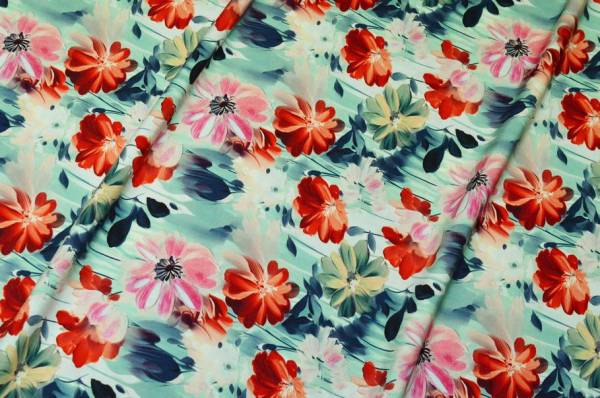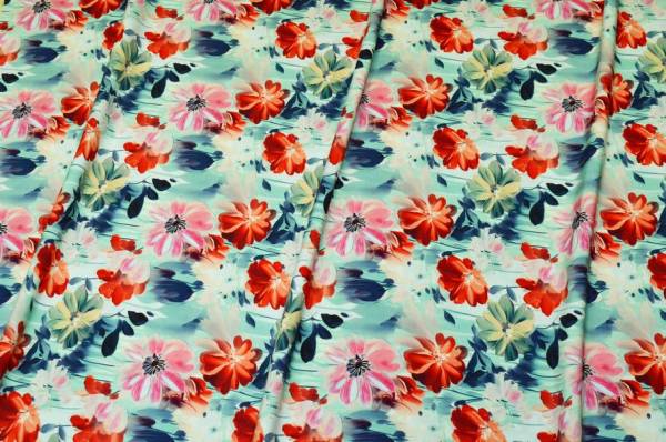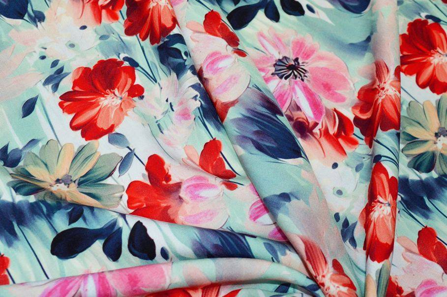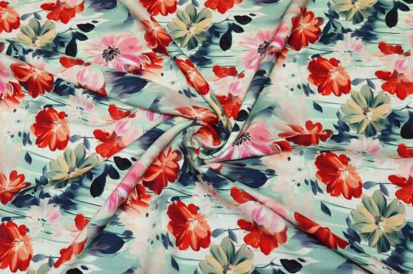 Tessuto in pura viscosa fresco e leggero, dalla mano morbida e fluida, ideale per capi confortevoli e femminili. Il fondo è arricchito da una fantasia floreale nei toni del rosso e dell'azzurro. Leggero e perfetto per la realizzazione di camicette, vestitini, gonne e capi primavera/estate.