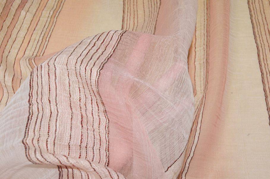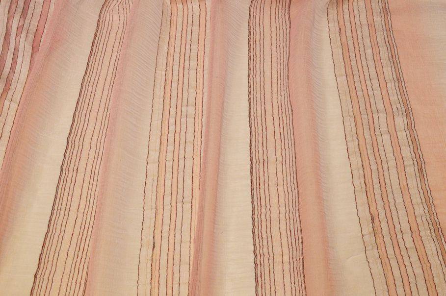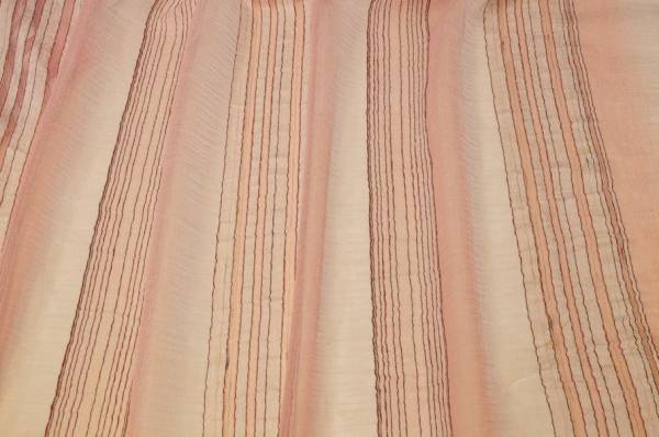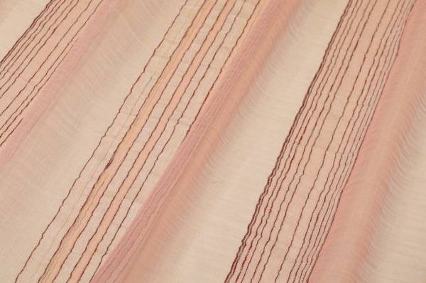 Tessuto in organza con effetto stropicciato, caratterizzato da una delicata colorazione nei toni del rosa. Nato per la confezione di tendaggi, in particolare tende arricciate, si distingue per la sua leggerezza, trasparenza e caduta fluida.