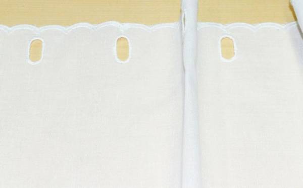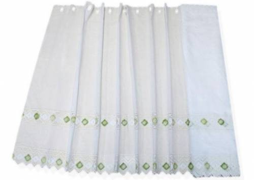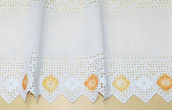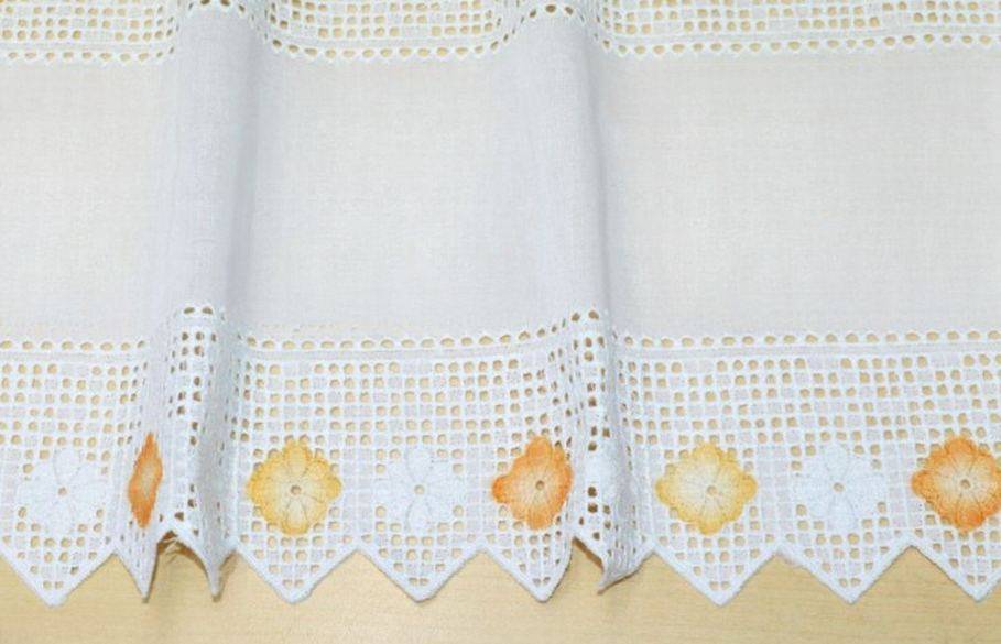 Tendino a vetro di colore bianco naturale decorato da graziosi incassi in pizzo con fiori gialli. La base presenta una leggera trama misto lino dalla mano leggera, semicoprente e filtrante alla luce. Nella zona superiore della tenda ci sono degli occhielli dove si inseriscono le apposite astine per tendini a vetro (sia a molla che con ganci). Smerlato sul fondo. Necessita di cucitura soltanto ai lati dove viene effettuato il taglio.