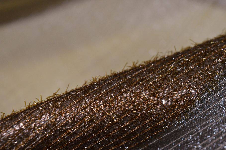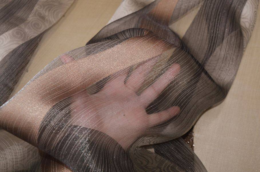 Ogni fascia presenta una lavorazione diversa: una parte rasata, una con disegno jacquard, una con inserimenti lurex arricchita da filati laminati nei toni ramati e marroni in rilievo. L’alternanza delle lavorazioni dona movimento alla superficie mantenendo una buona trasparenza.