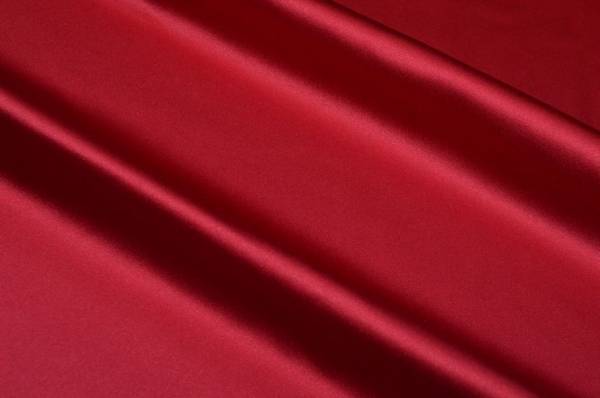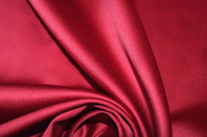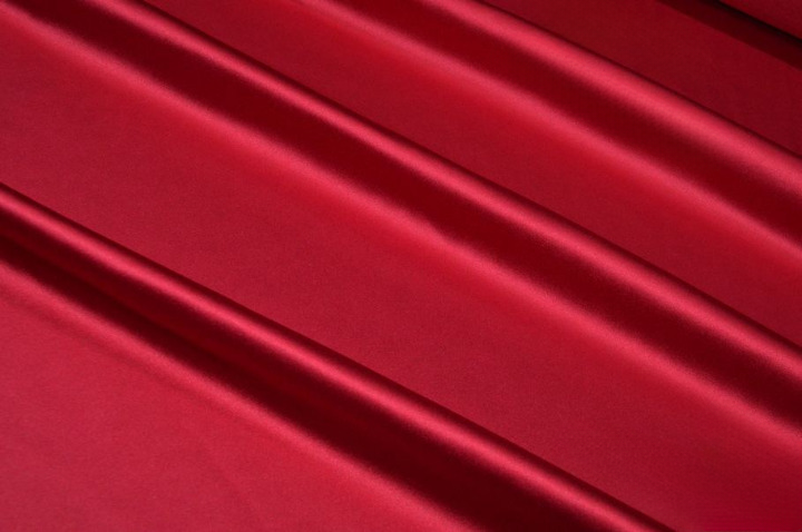 Tessuto rasatello stretch in colore rosso rubino, caratterizzato da una superficie liscia e lucente.
