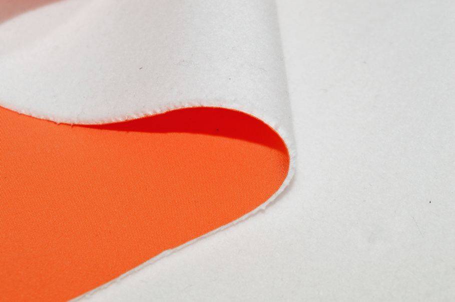 Tessuto tecnico neoprene, caratterizzato da un lato arancione liscio, mentre, l'altro lato presenta una sorta di strato in pile bianco, che conferisce maggiore comfort e calore.