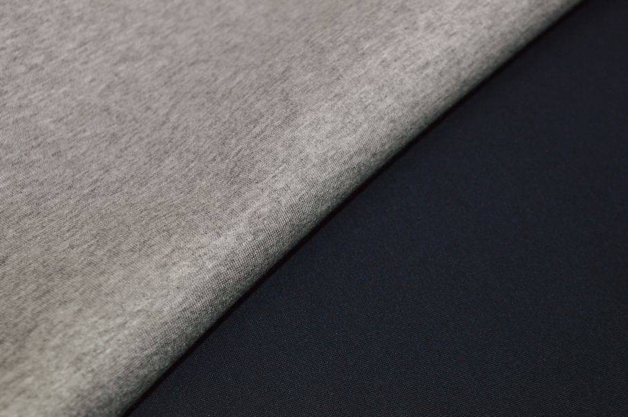 Tessuto tecnico di neoprene double in viscosa composto da un lato blu e da uno grigio con sottile gommapiuma centrale. Di struttura sostenuta è un prodotto idoneo per realizzare giubbini ed abbigliamento sportivo.