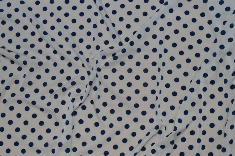 Vendita online tessuti abbigliamento poliestere maglina bi stretch pois blu su fondo bianco - Tessuti & Stoffe