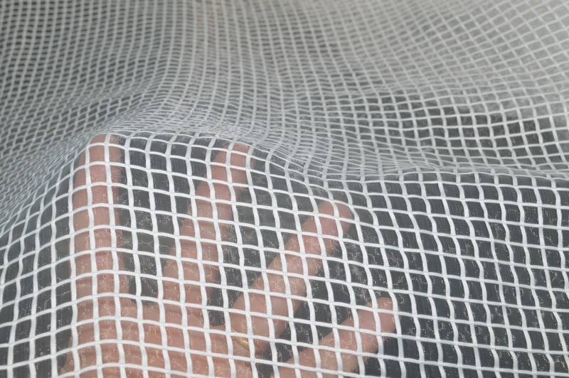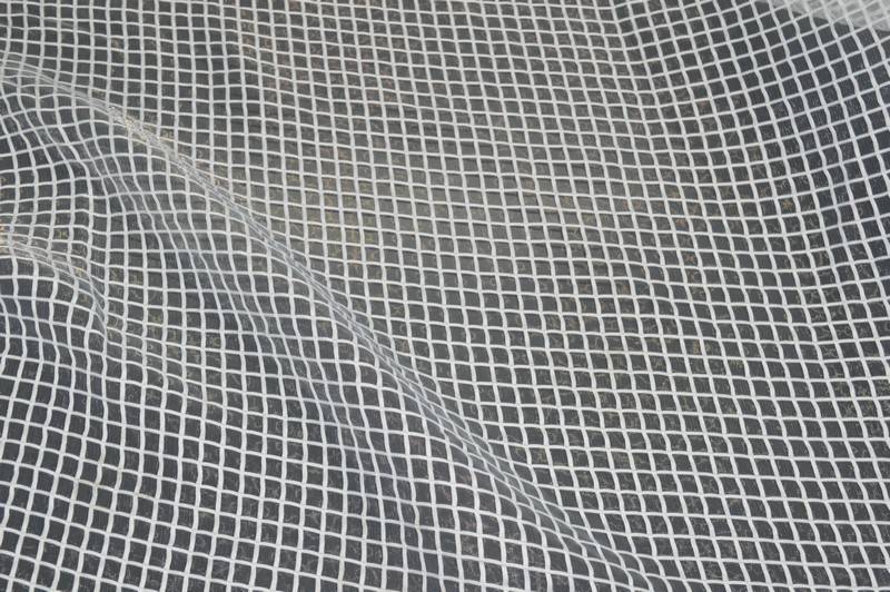 Tessuto in organza trasparente, leggera ma dalla struttura sostenuta, con ricamo a quadri in rilievo bianco, idoneo per camiceria e vestitini. Non forata