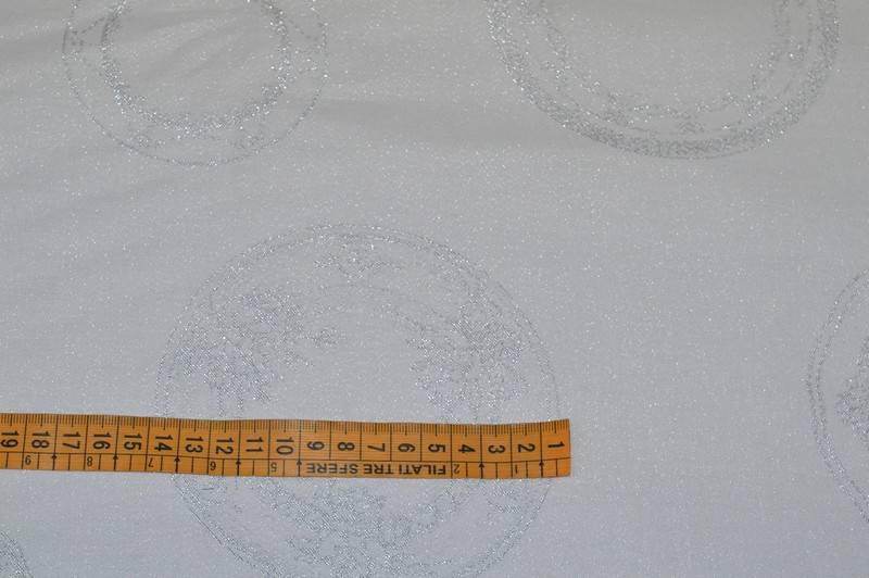 Tessuto in misto cotone con fondo bianco ottico impreziosito da un'elegante filato lurex argentato che crea cerchi di differente dimensione (diametro variabile da 10 a 13 cm circa).