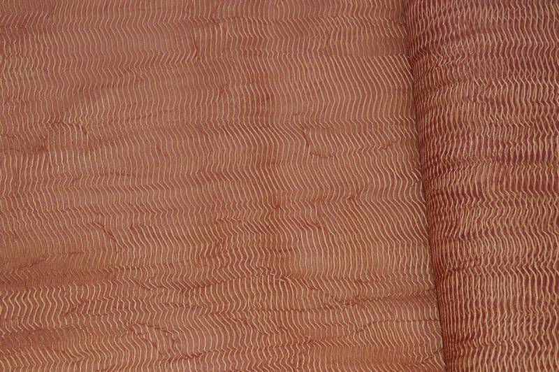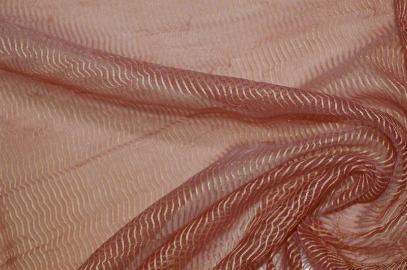 Organza  luminosa ,stropicciata, cangiante e leggera ma dalla mano sostenuta,rifinita con piombo, idoneo per la realizzazione di tende arricciate ,allestimenti ed addobbi , utilizzata anche per  abbigliamento e stole coprispalle. righine oro distanti 3 MM l'una dall'altra