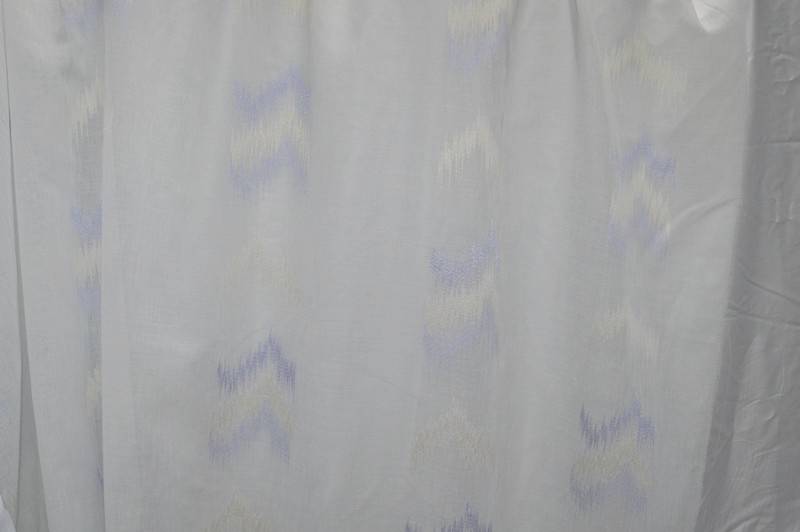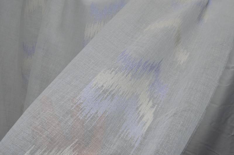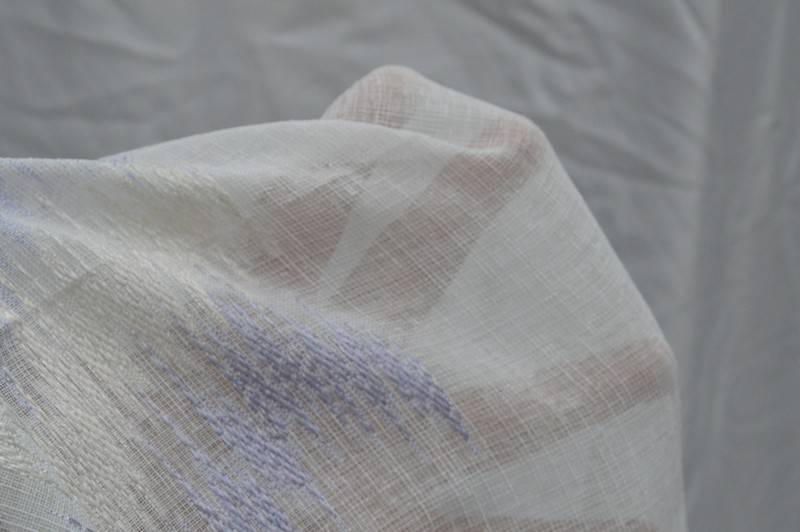 Tessuto a trama effetto lino con disegno ricamato geometrico lilla, idoneo per confezionare qualsiasi tipo di tenda , pannello, pacchetto e arricciate. Lavabile 30°. No stiro