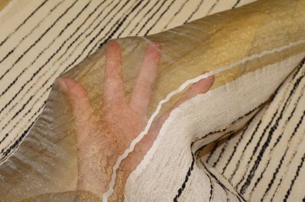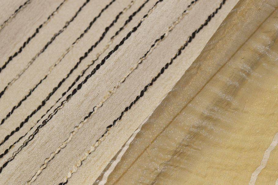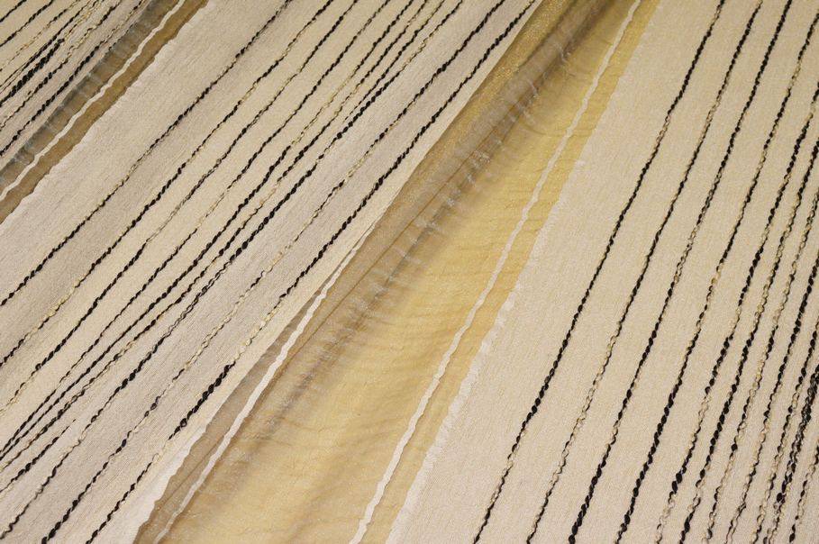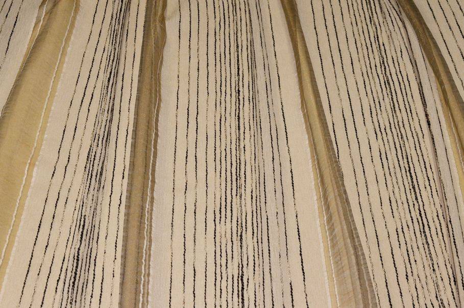 Tessuto per tendaggi in organza caratterizzato dall’alternanza di fasce con diversa trasparenza: bande in organza trasparente larghe cm 12 e fasce coprenti beige larghe cm 30.
