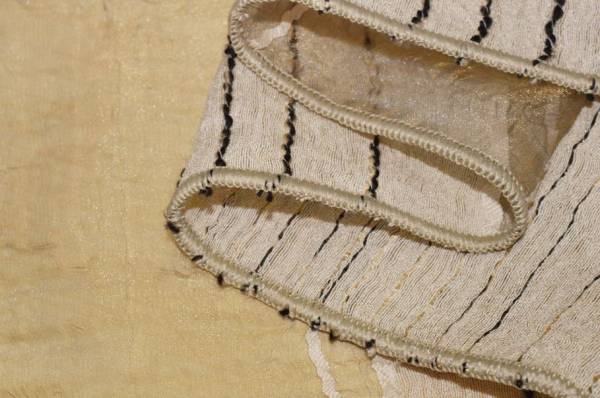 Il fondo beige presenta righe ricamate in rilievo realizzate con filato tono su tono e nero a contrasto, che donano movimento ed eleganza alla superficie. La parte in organza trasparente è impreziosita da un leggerissimo effetto cangiante che richiama sia i toni beige dorati del tessuto sia un delicato riflesso azzurro molto tenue.