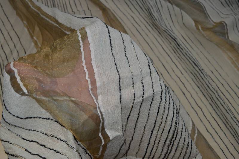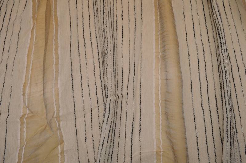 Tessuto con inserti di organza larghi cm 12 e fascia beige coprente larga cm 30, idoneo per tende arricciate e a vetro. Lavabile 30°. No stiro