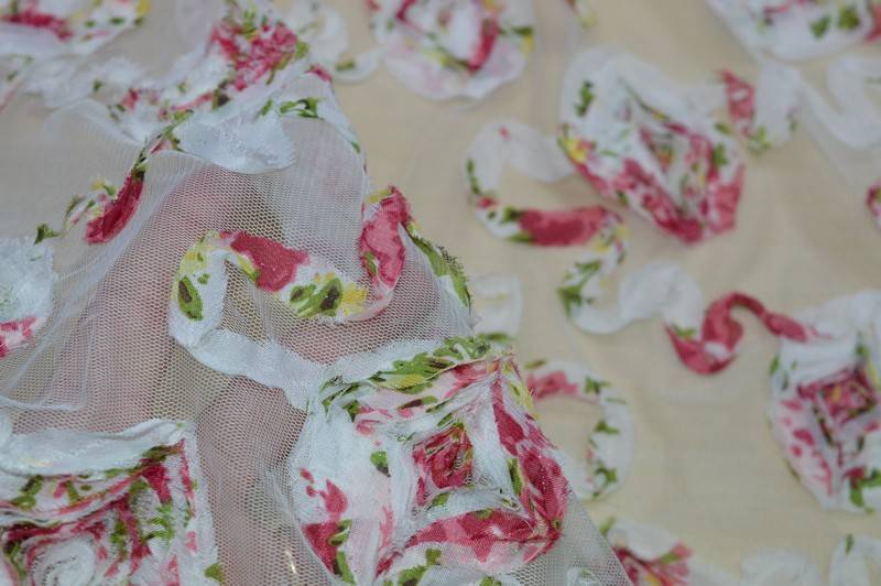 Tessuto fondo in tulle con fiori applicati idoneo per realizzare abbigliamento elegante di vario genere