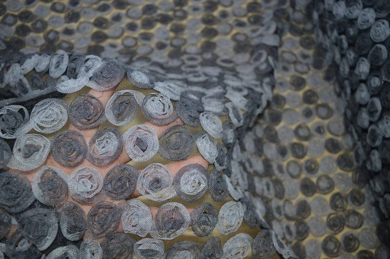 Vendita online tessuti abbigliamento ricamati pizzi tulle con fiori applicati nero/grigio - Tessuti & Stoffe