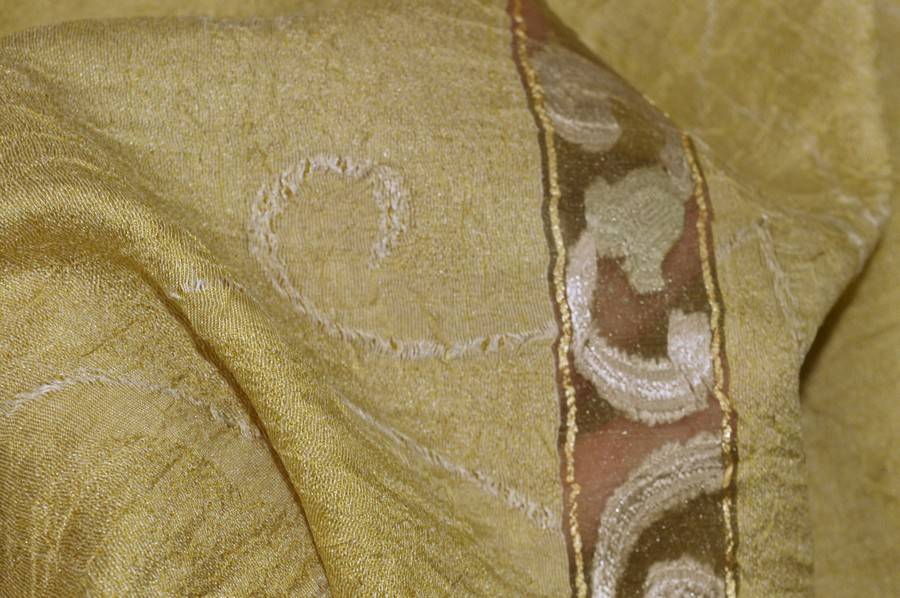 Tessuto morbido, effetto leggermente stropicciato con inserti lavorati fil coupè . Idoneo per tende arricciate. Rapporto disegno cm 30