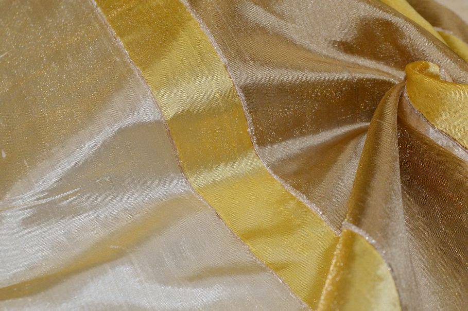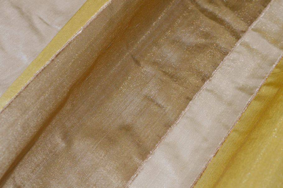 Tessuto shantung realizzato con filati di misto seta che conferiscono una struttura leggermente sostenuta alla stoffa. Il fondo, delicato e leggero, garantisce un'adeguata privacy grazie alla sua semitrasparenza. Il design si distingue per le fasce medio-larghe che combinano in modo armonioso diverse sfumature di giallo, beige ed avorio, creando un effetto visivo originale ed al tempo stesso raffinato. La superficie è arricchita da un bellissimo e delicato effetto shantung che riproduce le fiammature irregolari tipiche di questa lavorazione. Inoltre la superficie molto luminosa esalta ulteriormente la sua eleganza e raffinatezza. Ideale per la realizzazione di tende, mantovane, cuscini e altri complementi d'arredo.