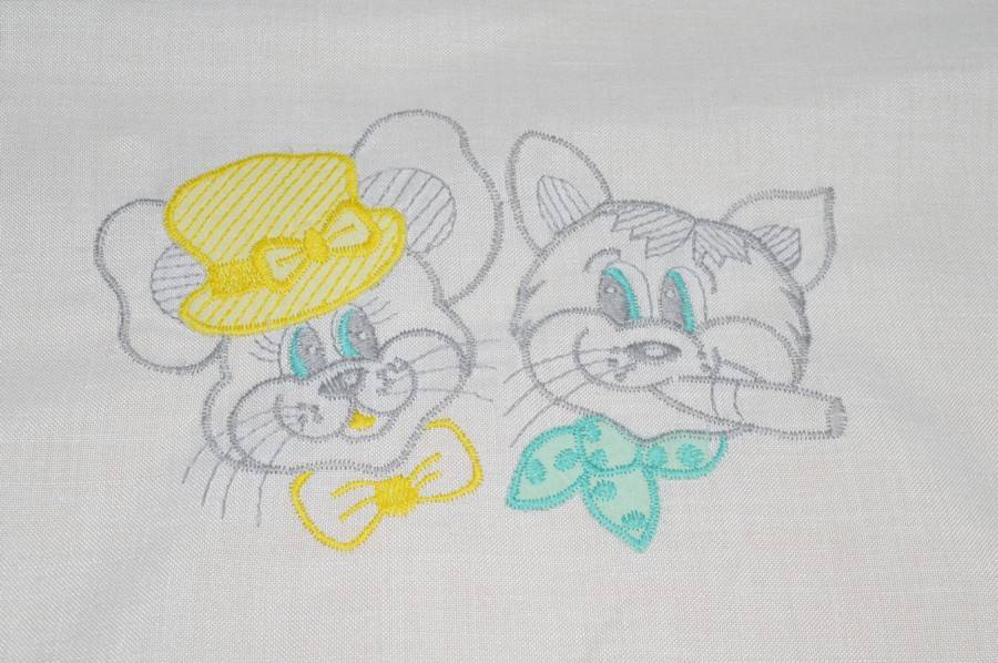 Tessuto tendino in misto lino a trama fitta e regolare con ricamo gattini. Dal centro del ricamo al centro del ricamo successivo cm 50