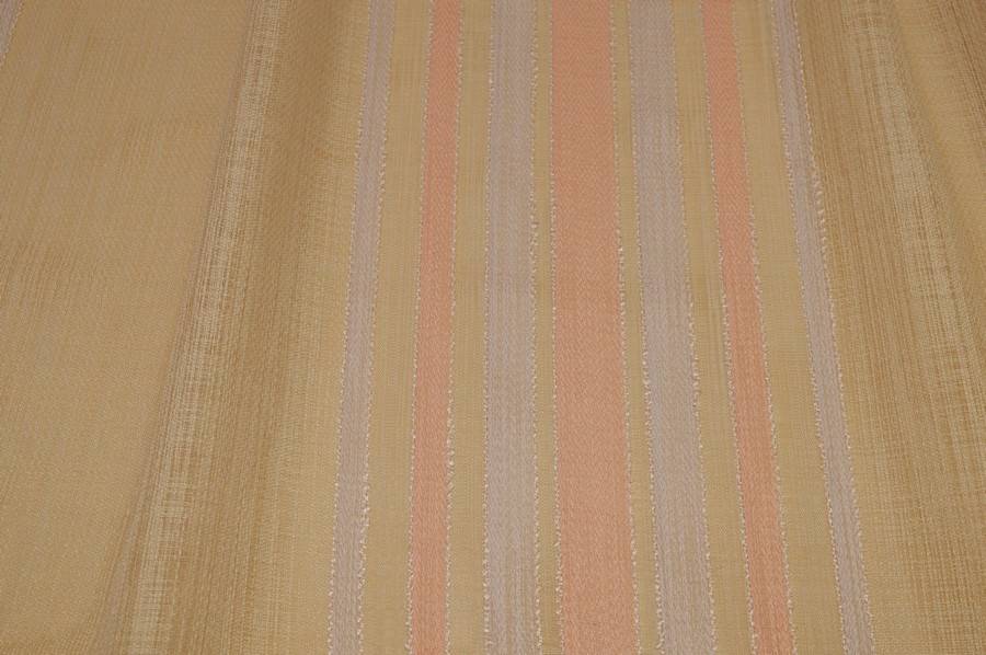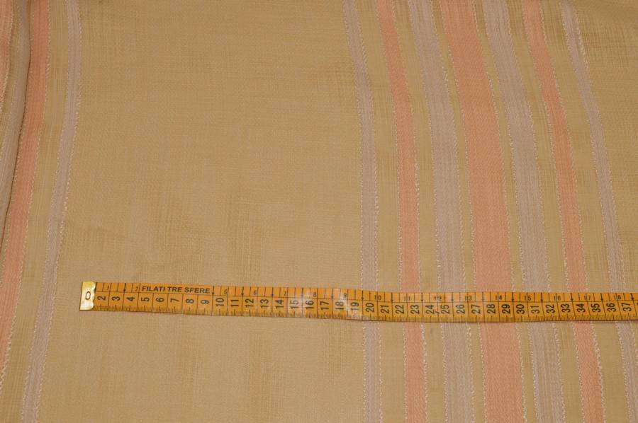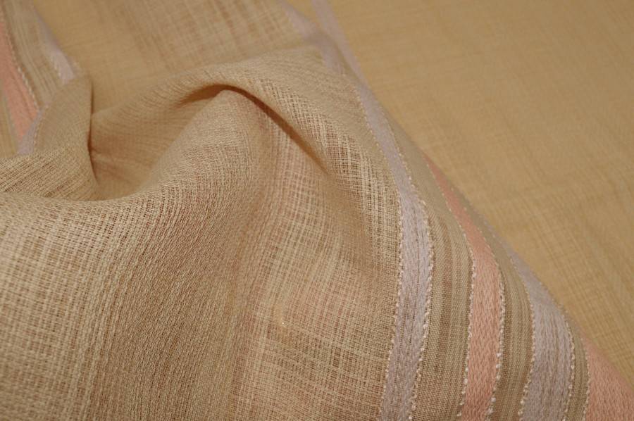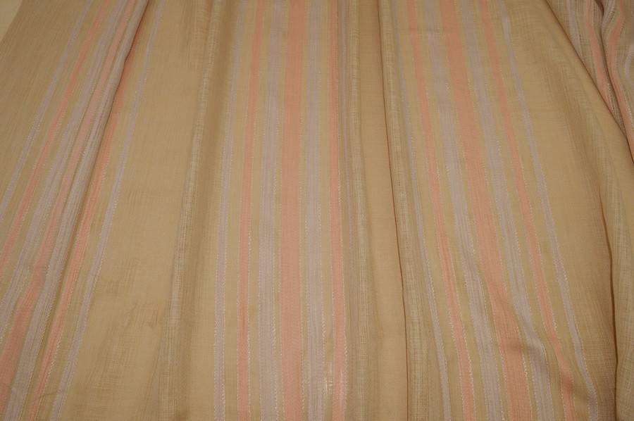 Tessuto morbido e coprente (ma filtrante alla luce) fondo beige e riga rosa chiaro. Idoneo per realizzare qualsiasi modello di tenda arricciata e tendini a vetro