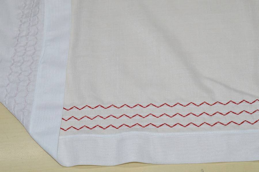 Tessuto misto lino fondo bianco con ricamo Zig-zag rosso nei bordi laterali. Idoneo per realizzare tendini a vetro